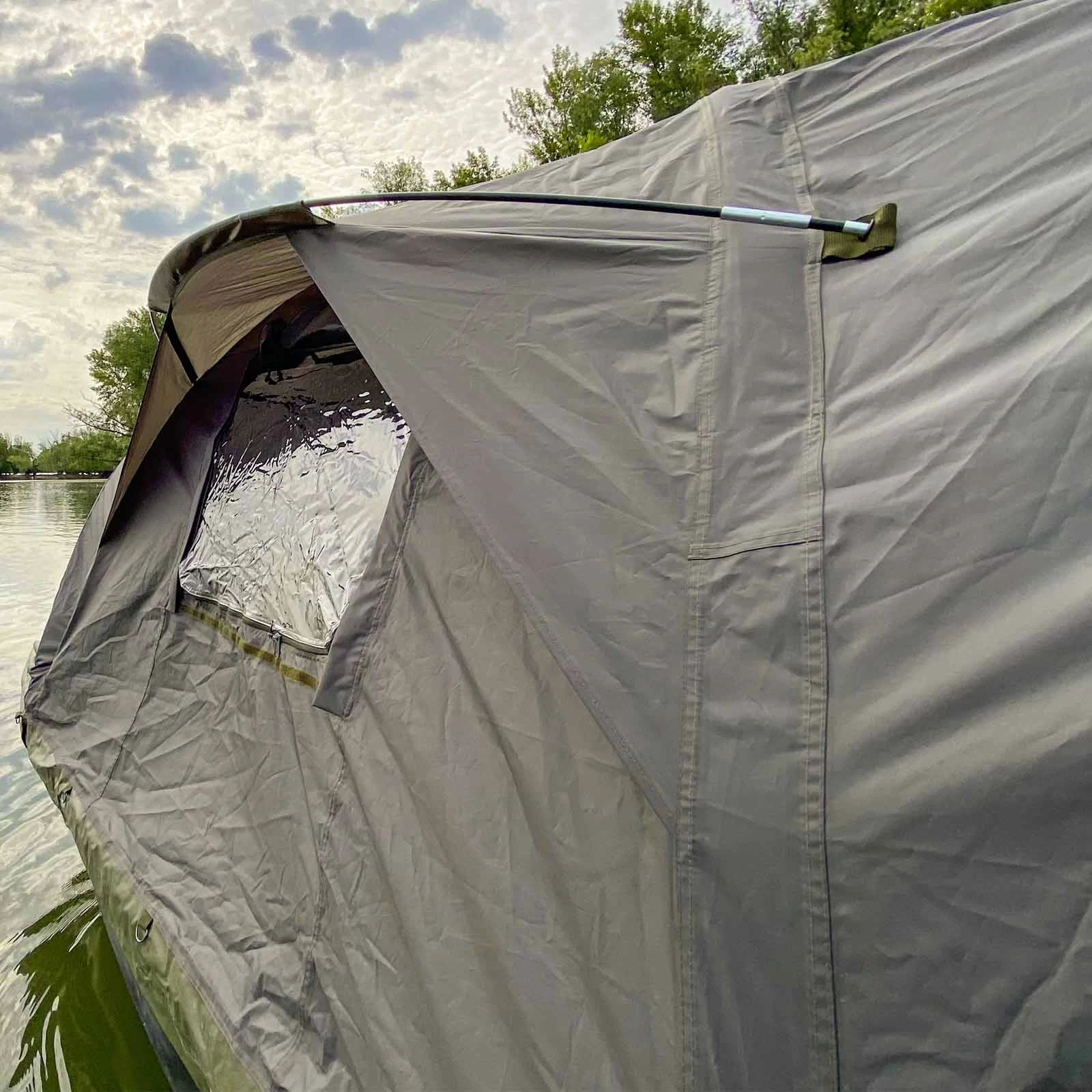Innenseitig der bodenlangen Tür sind wieder die bereits bewährten Klettverschlusstaschen zur Aufnahme von optionalen Bleigewichten vernäht, um das Flattern der Tür bei Wind zu minimieren. Große Klarsichtfenster im Eingangsbereich ermöglichen die Sicht auf die Rutenspitzen. Die Klarsichtfenster können je nach Wetterlage beliebig durch die darunterliegenden Moskito-Netzfenster ersetzt werden.