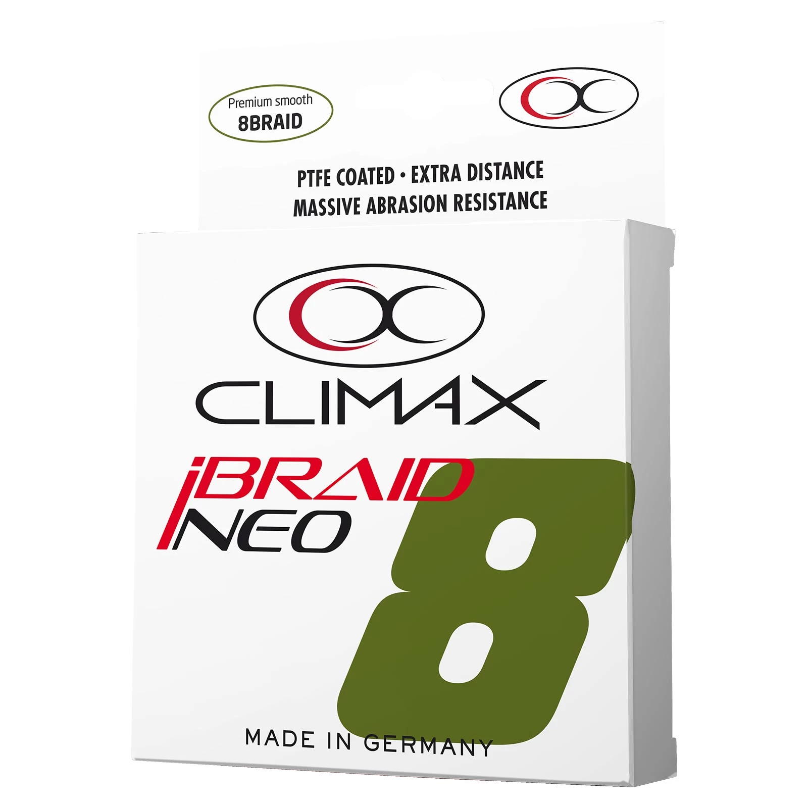 Durchgehend 8-fach und eng geflochtene Climax iBraid NEO 8 oliveHochleistungsschnur aus 100% HMPE-Fasern! Aus den neuesten, noch dünneren HMPE-Fasern auf modernsten Maschinen geflochten und per Laserkontrolle optimal verstreckt!
