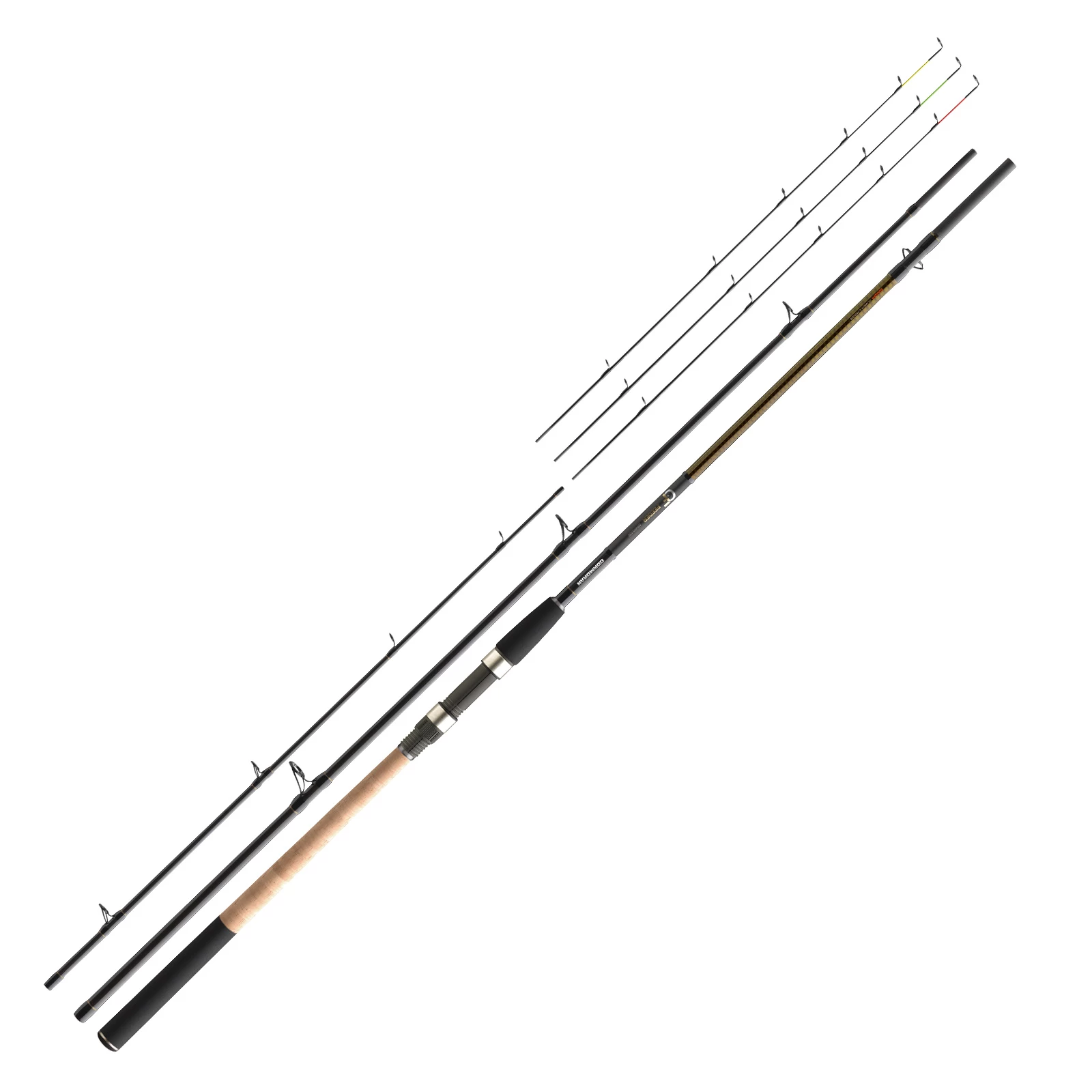 Ausgestattet mit leichten, schnurschonenden SiC Ringen und einem langen Weitwurf Kork/EVA Griff. 3 Feederspitzen gehören zum Lieferumfang ebenso wie ein Stofffutteral.