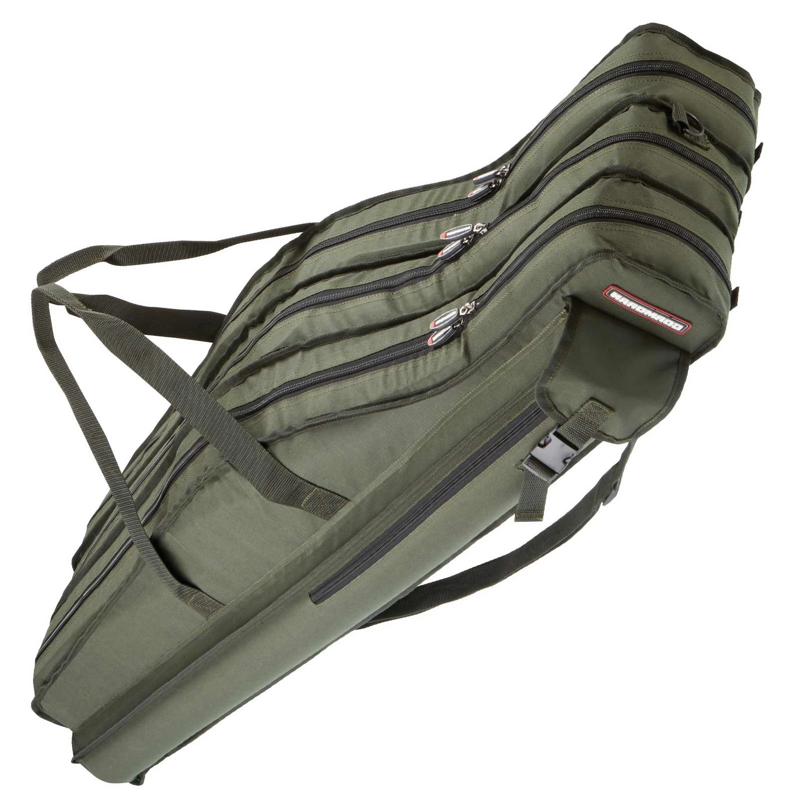 Klassischer Cormoran Rutenkoffer Modell 5093 mit drei getrennten Abteilen für montierte Ruten. Die lange Außentasche, die über die ganze Länge per Reißverschluss geöffnet werden kann, nimmt Schirm oder Banksticks auf. Mit 2 verstellbaren Rucksack-Schultergurten, Tragegriff und robusten Hängeösen oben und unten.