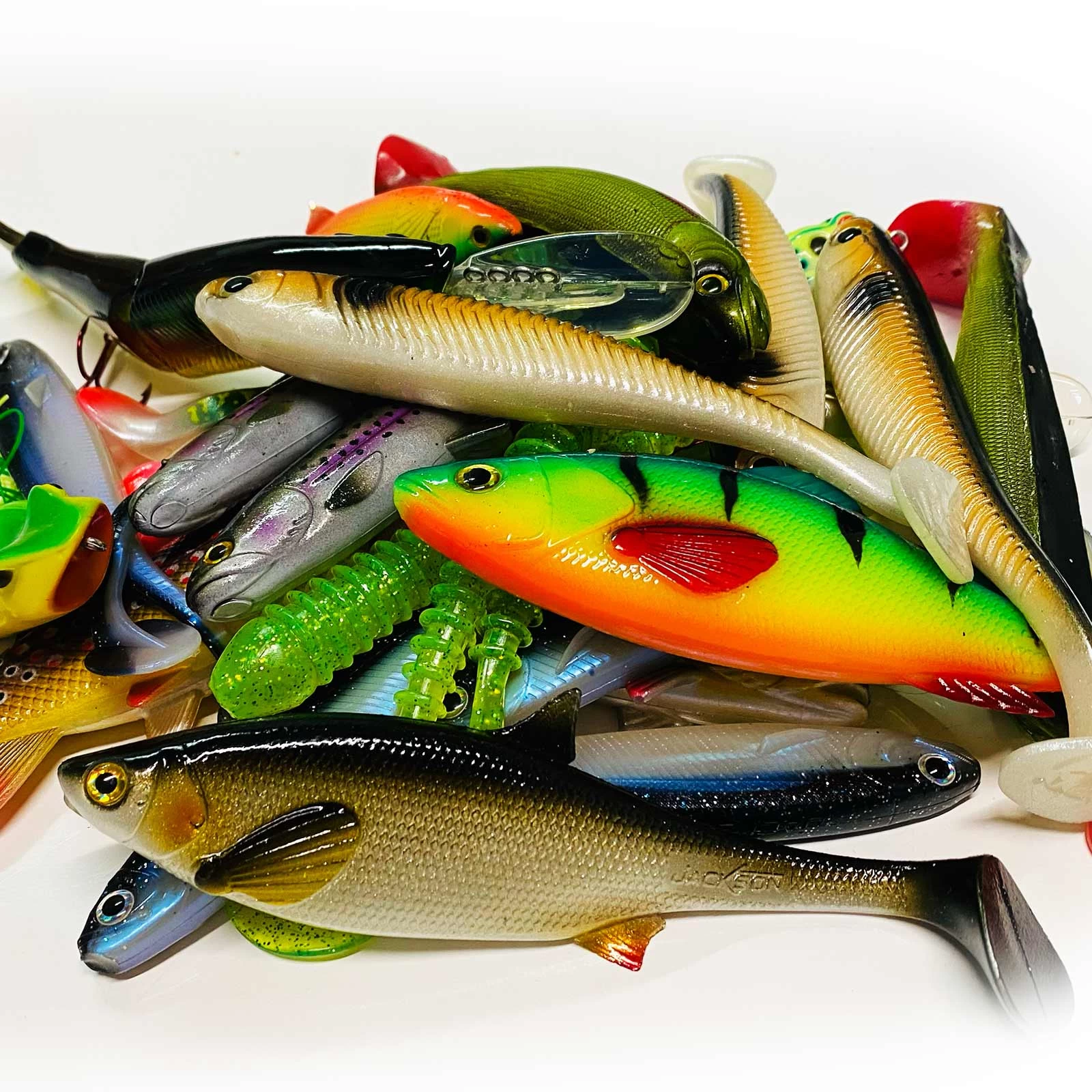 Inhalt: 22 Gummifische, 2 Frösche und 3 Wobbler. Die Köderlänge beträgt 13 bis 18 Zentimeter.