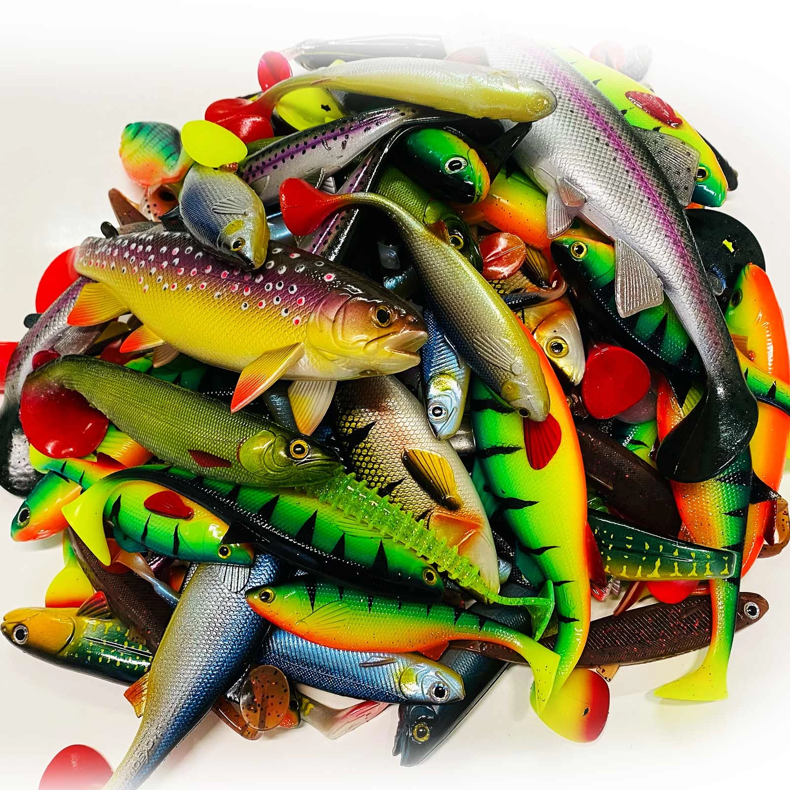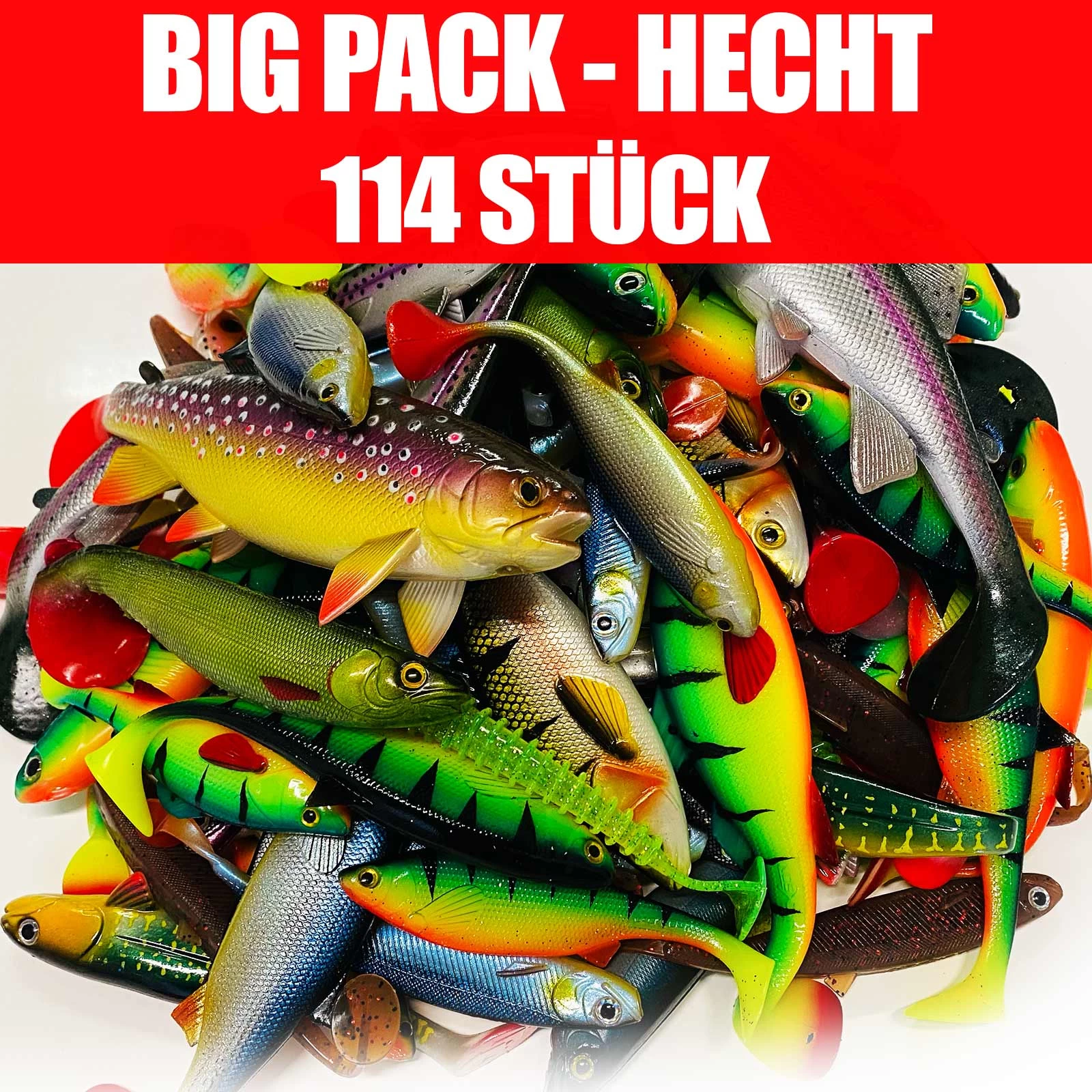 Inhalt: 114 Gummifische. Die Köderlänge beträgt 13 bis 23 Zentimeter. Dieses Angelköder-Set ist punktgenau auf das Fischen von Hecht und Großhecht abgestimmt.