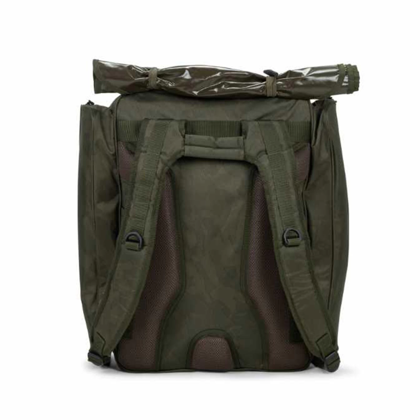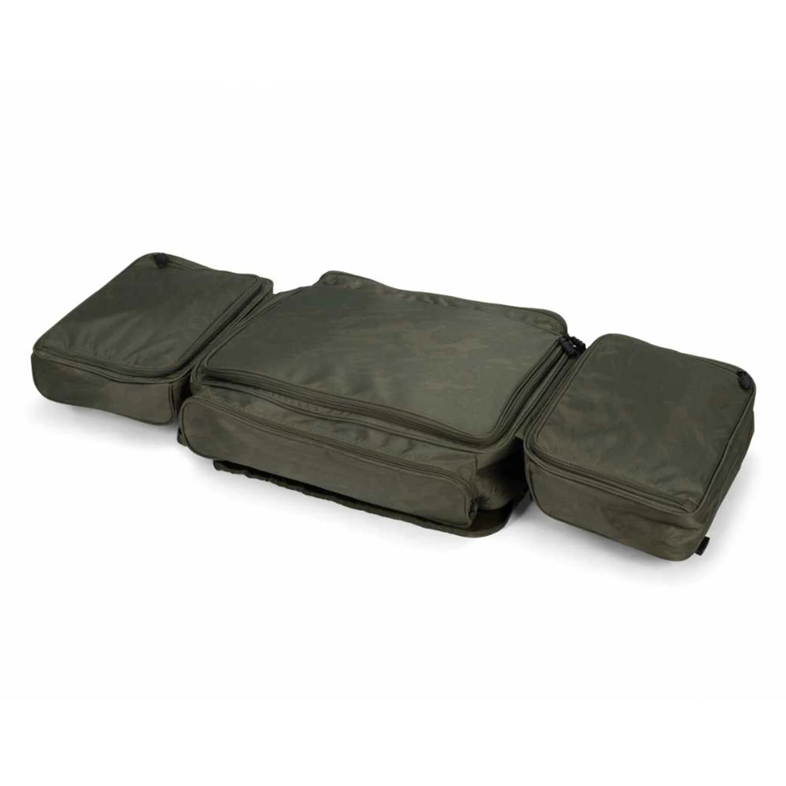 Die Endfächer haben eine wasserfeste Oberfläche, während das Hauptfach mit einem Reißverschlussdeckel und sechs elastischen Netztaschen auf der Innenseite ausgestattet ist. Das komplette Innenfutter ist mit dem Nash Micro-Fischmuster in Camo bedruckt.