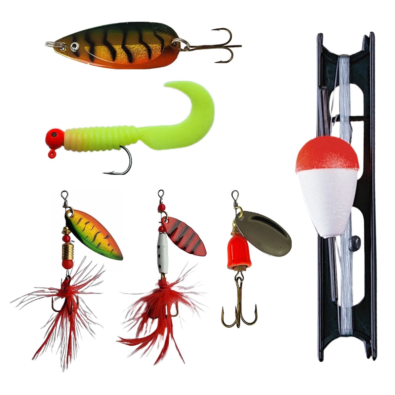 - Fladen Kunstköderset. 5 Teile. 3x Spinner. 1x Blinker. 1x Gummiköder mit Jigkopfhaken – fangfertig montiert.