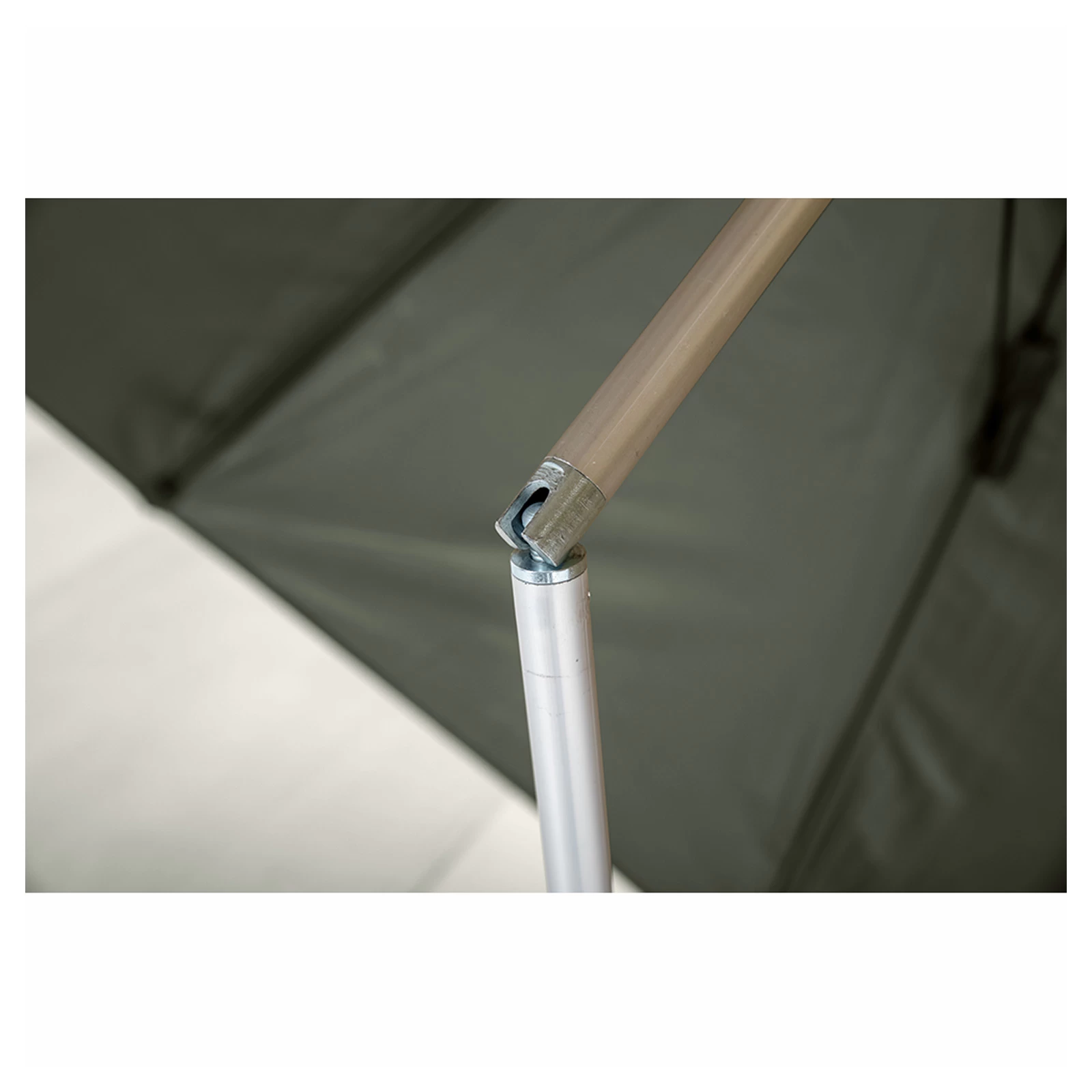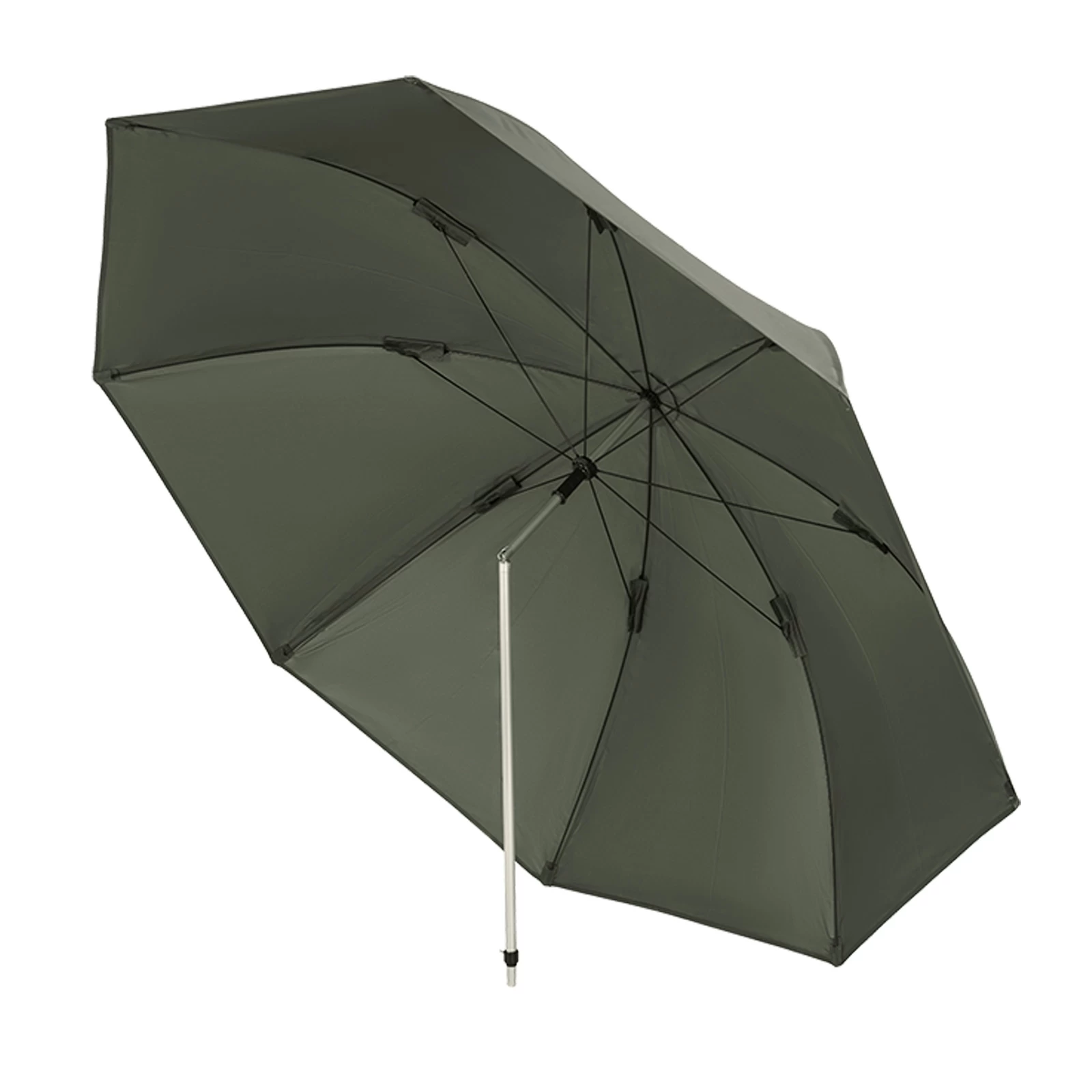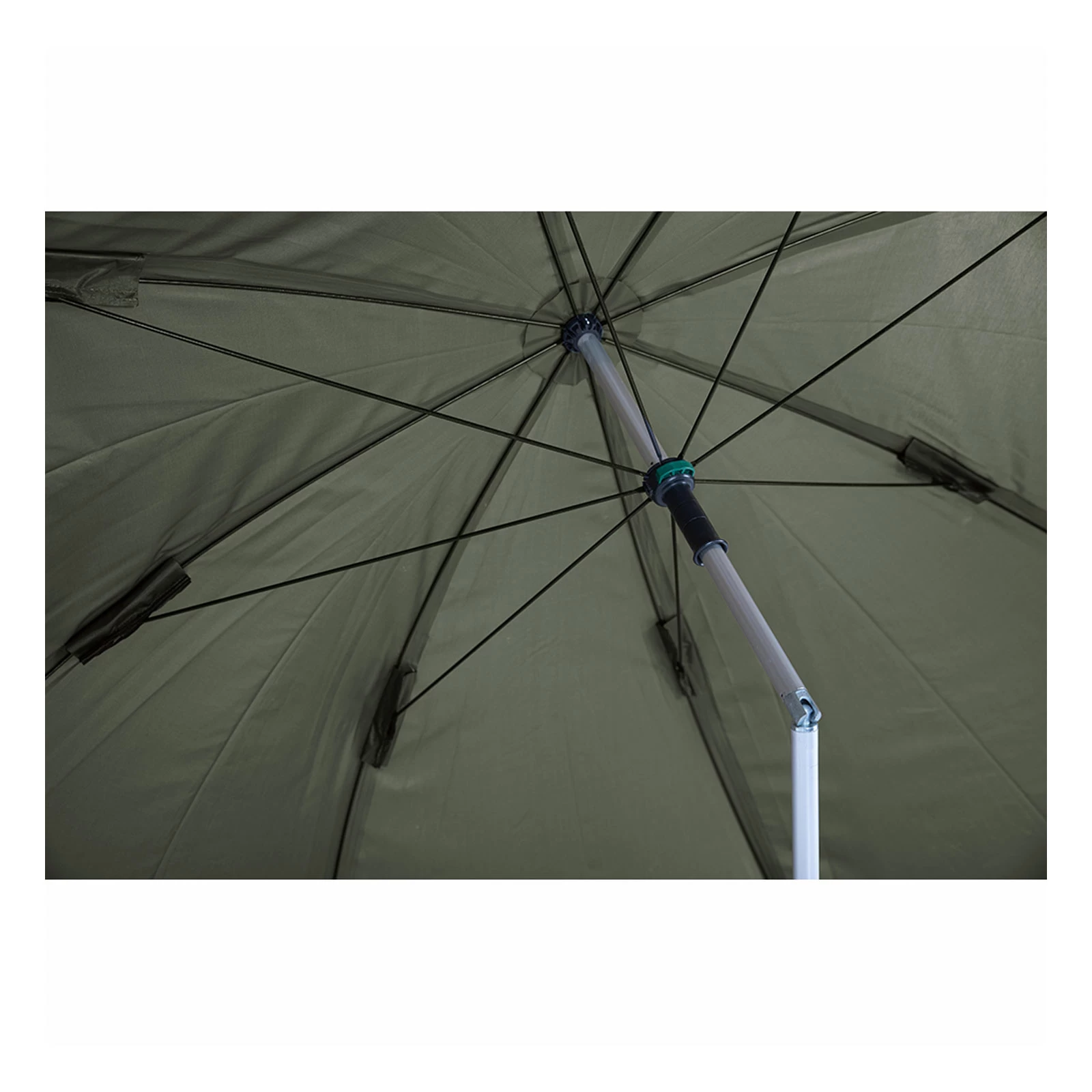 Die Acht-Rippen-Konstruktion sorgt für eine größere Oberfläche, sodass Wind und Regen gleichmäßig abgeleitet werden können. Die dreh- und neigbare Mittelstange lässt sich leicht abwinkeln, so dass der Angler seinen Platz entsprechend maximieren kann.