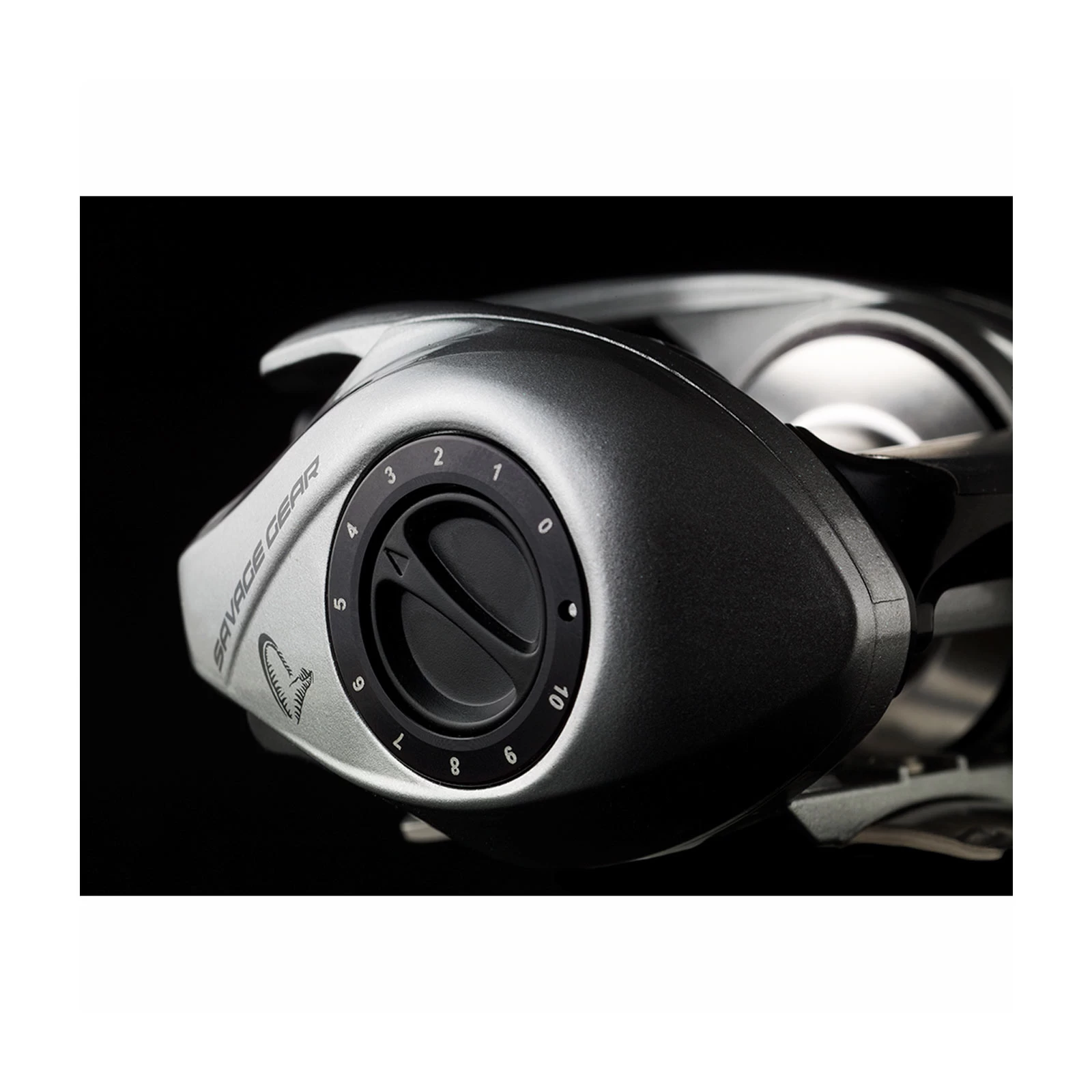 Neben den offensichtlichen beeindruckenden Merkmalen wie 9+1 Edelstahlkugellager, ein gefrästes Getriebe, DuraGrease und ein superstarkes und steifes Aluminiumgehäuse und eine Seitenplatte, ist das wahre Highlight die externe Zentrifugalbremse. Diese Bremse sorgt für ein leichteres Werfen und Drillen des Fisches, eine größere Wurfweite, eine Reduzierung von Knoten und Verwicklungen und weniger Probleme beim Werfen bei starkem Seitenwind.