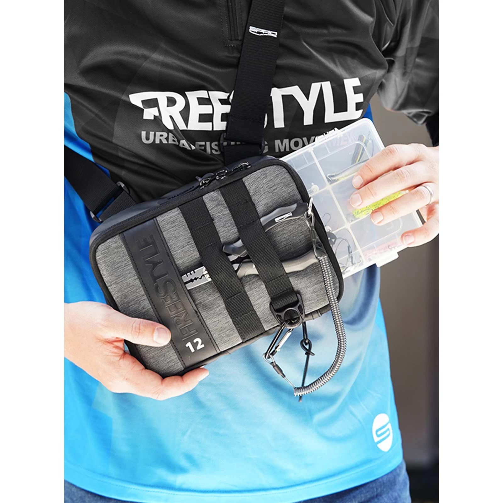 Die Side Pouch 12 ist eine kompakte Angeltasche, die um eine Freestyle-Tacklebox herum gebaut wurde. Die Vorderseite lässt sich vollständig öffnen und gibt den Blick auf ein großes, herausnehmbares Rigged Lure Board frei, das Du zur Aufbewahrung von montierten Ködern und Haken nutzen kannst.